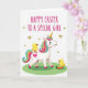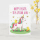 This card features a white unicorn-like horse with a shiny golden horn, and its mane and tail flow in rainbow shades of pink, blue, green, and yellow. A small bright-yellow bird with rosy cheeks sits close on its back, leaning in as if sharing a quiet moment of friendship. A pink heart shape appears on the horse’s hindquarter, reinforcing the affectionate tone without needing extra words. Near the bottom, a second yellow bird stands by an orange carrot on a soft green oval patch, as if offering it or teasing it with a gentle, friendly curiosity 🐰. The background stays white and open, sprinkled with small golden hearts that float around the characters like confetti. Across the top, a seasonal greeting is written in large bright-pink lettering, centered and easy to read, with the text standing out clearly against the white space 🌷. The golden hearts are scattered unevenly, with a few clustered near the top corners and several drifting around the unicorn’s head.