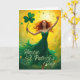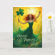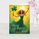 A cheerful, red-haired woman in an elegant green dress dances full of joie de vivre in front of a bright, golden yellow background. She is holding a large four-leaf clover in her hand, while small clovers float in the air around her. The scene radiates energy, happiness and celebration, fitting for St. Patrick's Day.