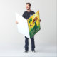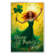 A cheerful, red-haired woman in an elegant green dress dances full of joie de vivre in front of a bright, golden yellow background. She is holding a large four-leaf clover in her hand, while small clovers float in the air around her. The scene radiates energy, happiness and celebration, fitting for St. Patrick's Day.