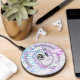 This designs features a illustration of a cute unicorn with wearing glasses with pearls hanging from the horn and glasses. The words in all capital letters say, “Teaching is Magical!” You can update the template with a teacher’s name or monogram. It will appear as cursive font below the unicorn illustration. The background is swirly with colors that seem to come from the unicorn horn. Colors in this design are pink, purple, blue, black and white. Design by Ms_Jade. © Ms_Jade