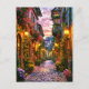 A vibrant, dreamy alleyway in a magical town at sunset. The cobblestone street reflects the warm glow of lanterns in shades of gold, green, and crimson, creating a soft, enchanting ambiance. The walls of the tall, narrow buildings are adorned with colorful flowers cascading from window boxes and balconies. A radiant sky transitions from fiery orange to deep pink and soft purple, filling the scene with an ethereal light. The atmosphere is romantic and whimsical, evoking the feeling of stepping into a fairytale world.
