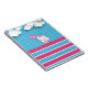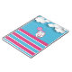 This design shows a happy unicorn holding a big lollipop, flying under white clouds with a colourful spriped background
