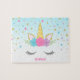 Unique custom unicorn jigsaw puzzle for kids. This cute design features a unicorn face, flowers and stars. Personalize with a name for a special gift!
