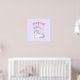 A poster with an adorable white unicorn with pastel green, purple, yellow and pink curly mane and tale. This magical creature is laying down sleeping peacefully with a rainbow colored shooting star flying over her head. Text says "Magical" in a pink trendy font. Pastel purple background.