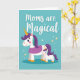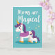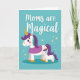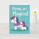 Designed with a calm blue‑green background, this card shows two unicorn-like creatures in the lower half, drawn with simple shapes and gentle expressions that feel affectionate. The larger one is bright white with a flowing purple mane and tail, a turquoise streak, and a golden spiral horn, standing close as if keeping watch with quiet care ❤️. Beside it, a smaller companion with a petite golden horn and purple hair tilts its head up toward the taller figure, creating a tender, trusting moment between them. Both have small pink blush on their cheeks and round black eyes that make the scene feel friendly and soft. Across the top, the message “Moms are Magical” sits centered in flowing white lettering, standing out clearly against the cool background. Around the pair, tiny golden four-point stars and faint white speckles are sprinkled like a gentle night-sky dusting 🌼. A magenta saddle-like cloth rests on the larger creature’s back, while the stars float above them in the open space.