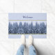 This doormat features a snowy winter forest. Snowy fir trees in blue tones on a delicate background. Original Photograph. Festive, custom doormat for the season!