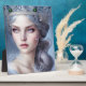 Pretty Queen of Winter with an adorned silver crown on silver hair - a fantasy holiday tabletop art plaque created using AI rendering software.