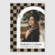 This modern and unique graduation announcement features a tan and black checkered background highlighting a photograph of the graduate framed in a white arch with the graduate's name and school beneath. A small gradation cap is cleverly displayed in the checked background with the graduate's graduation year. This magnetic graduation photo card makes a great keepsake commemorating the graduate's achievements.