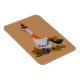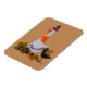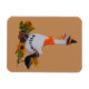 Goose with orange kerchief sits amid fall floral accents, next to blackbird. Black hat on goose has orange ribbons. Yellow and orange sunflowers sit among green leaves.