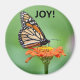 3" round magnet with Monarch butterfly on Zinnia flower with the exhortation JOY!