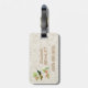 Personalized luggage tag with a vintage illustration of the Magnificent Hummingbird - a green and gold hummingbird perched on a tropical plant with coral pink flowers, on a light gold marble texture background.