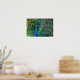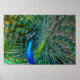 Print featuring a magnificent peacock with its beak open and its tail feathers open, showing off his beautiful iridescent green, blue and bronze colored feathers. Beautiful wall decor for bird and nature lovers. Photo taken in Arcadia, California.
