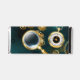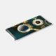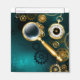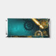 An antique magnifying glass with golden handle and convex lens on green background with gold gears and an antique clock. Steampunk style.
