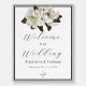 Greet your guests with southern flower theme featuring elegant magnolia flowers. Click the custom button to easily change the initials above and below the eternity symbol, the names, location and date.