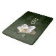 Super soft bath mat with a large creamy white magnolia blossom on a deep green background and monogrammed with your initials in a soft creamy white.