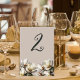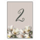 Southern magnolia wedding reception table number cards with number on both sides. White magnolia flowers make a border along the bottom of pinkish beige color cards. Fill in a number using the template and it will automatically print on both sides. Add the card to your cart, click on the card, in your cart to go back to the product page and enter a different number - add to your cart - and so on for as many numbers as are needed.