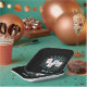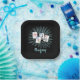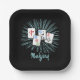 Paper party plates with Mahjong game tiles and blue sunburst on black background and customizable text.