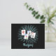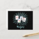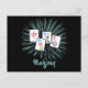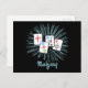 Postcard with Mahjong game tiles on blue sunburst background and customizable text.