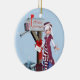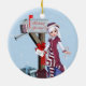 A cute "Holiday Greetings" Mail Carrier Elf double sided ceramic holiday ornament. This fun holiday ornament features a cute elf girl with a letter in her hand, standing next to a mailbox with presents at her feet! The mailbox has a red gift inside with a golden bow, and a bright red bow on it too. All are in front of a cheery blue wintery snow falling background. The mailbox also reads "Holiday Greetings" Digital art by XG Designs NYC. A great gift for friends, family or a special mail carrier, mailman, or mail woman! For more occupational, mail carrier holiday cards and gifts please visit our shop!