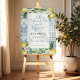 The "Main Squeeze | Watercolor Lemon Mediterranean Tile Bridal Shower Welcome Sign" is a beautifully crafted welcome sign that is perfect for a lemon-themed bridal shower. This sign showcases vibrant watercolor lemons, elegant greenery, and a Mediterranean tile pattern in soft blue and yellow tones, which adds a touch of elegance and joy to the celebration. Designed by CaMiDesigns, it offers details on orders, shipping, product information, and additional assistance through Zazzle Customer Care directly.