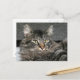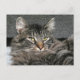 Gray tabby Maine Coon mix cat stares out of this photo postcard, chin almost buried in his ruff or mane.