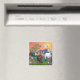 A golden castle, a unicorn, a dove, and a shy rabbit are some of the enchanting elements that form the background for a Maine Coon tabby cat who sits by a crystal blue river the flows underneath the swirly sky in red and orange.