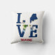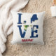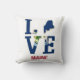 Maine state love. Main in bright red uppercase sans font. The word love is filled with the state flag and the letter O in love is shaped in the silhouette of the state of Maine.