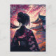 Computer-generated design of a Geisha in a cherry blossom spell. A picture of a woman wearing a kimono, with a pretty high-rise hair and flowers in her hair. Japanese design in AI - Midjourney Style. In the background, Japanese buildings.