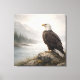 A majestic bald eagle stands poised on a moss-covered rock beside a misty river, its piercing golden eye fixed on the distance. Snow-dusted mountains and evergreen forests fade softly into the background, creating a serene yet powerful wilderness atmosphere. The eagle’s white head and tail contrast strikingly with its rich brown plumage, symbolizing strength, vigilance, and freedom.