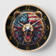 A majestic bear proudly wears an American flag on its head, symbolizing strength, patriotism, and unity.. With gold clock numbers
