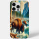 A vibrant painting depicting a mighty herd of bison crossing a rushing river with determination. The powerful animals brave the water as they move forward in unison, emphasizing their resilience and unity.