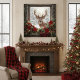 Capture the magic of a rustic, vintage Christmas with this breathtaking canvas print. A majestic deer (buck) with impressive antlers peers through a distressed, carved wooden window frame into a snowy, illuminated forest. The foreground features a rich, festive garland of deep red poinsettias, evergreen boughs, pinecones, twinkling lights, and a cozy red plaid blanket detail. Perfect for adding a sophisticated, nature-inspired, and warm focal point to your winter or holiday decor. This beautiful artwork evokes the spirit of a true winter wonderland.