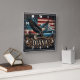A detailed eagle perched with wings spread wide against a backdrop of mountains and an American flag.