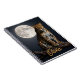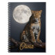 A powerful leopard with piercing yellow eyes and a sleek, spotted coat sits majestically on a stark, solitary branch. One paw dangles artfully across the center of the illustration, hinting at movement. Behind him, a vast, luminous harvest moon hangs in the inky night sky, casting an ethereal glow. Awesome personalized notebook for anyone who loves leopards.