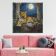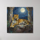 Leopard themed wall art. On the front is an illustration of a majestic leopard with fur like molten gold, laying on a cliff ledge bathed in ethereal moonlight. Intricate carvings adorn crumbling stone pillars, and bioluminescent flora casts a soft, otherworldly glow. The scene is rendered in a rich, textural oil painting style with thick strokes.