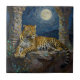 Leopard themed tile. On the front is an illustration of a majestic leopard with fur like molten gold, laying on a cliff ledge bathed in ethereal moonlight. Intricate carvings adorn crumbling stone pillars, and bioluminescent flora casts a soft, otherworldly glow. The scene is rendered in a rich, textural oil painting style with thick strokes.