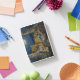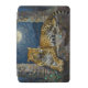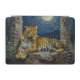 Leopard themed iPad case. On the front is an illustration of a majestic leopard with fur like molten gold, laying on a cliff ledge bathed in ethereal moonlight. Intricate carvings adorn crumbling stone pillars, and bioluminescent flora casts a soft, otherworldly glow. The scene is rendered in a rich, textural oil painting style with thick strokes.
