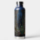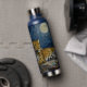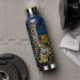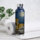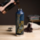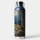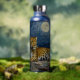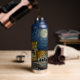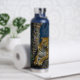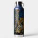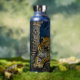 Leopard themed water bottle. On the front is an illustration of a majestic leopard with fur like molten gold, laying on a cliff ledge bathed in ethereal moonlight. Intricate carvings adorn crumbling stone pillars, and bioluminescent flora casts a soft, otherworldly glow. The scene is rendered in a rich, textural oil painting style with thick strokes.