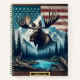 A regal moose emerges near a tranquil river, framed by tall trees and majestic mountains under a sky of stars and stripes.