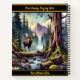 A magnificent moose stands gracefully on a log near a tranquil waterfall, surrounded by towering trees and a picturesque mountainous backdrop bathed in soft light.