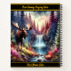 A majestic moose stands quietly beside a sparkling waterfall, surrounded by vibrant trees and blooming flowers. The serene atmosphere and colorful landscape create a peaceful evening vibe.