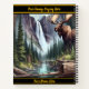 A serene moose stands by a shimmering river, surrounded by tall evergreens and cascading waterfalls. Mountain peaks rise in the background, capturing the essence of wilderness.