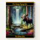 A striking moose stands near a crystal-clear stream, surrounded by tall trees and vibrant foliage, while a waterfall cascades peacefully in the background under a bright sky.