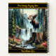 A majestic moose stands atop a tree stump next to a beautiful waterfall, surrounded by lush trees and vibrant foliage, capturing the tranquility of wilderness life in nature's embrace.