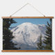 Decorate your living space with this horizontal, hanging wall tapestry with wooden tops that features a photo image of majestic, snow capped Mount Rainier, located in the Cascade Mountains of Washington State.