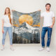 This bold mountain blanket showcases a towering snow-capped peak set against a textured golden sun and a misty, distressed sky. Dark pine forests in the foreground add depth and contrast, creating a dramatic wilderness scene with a rustic, bohemian touch. The rich blend of cool mountain tones and warm golden hues makes this versatile. A unique gift idea for outdoor adventurers, hikers, campers, nature lovers, or anyone who appreciates modern rustic landscapes. Ideal for birthdays, holidays, or seasonal gift giving.