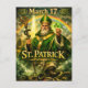 A powerful and detailed digital illustration of St. Patrick, the patron saint of Ireland. He is depicted with a long white beard, wearing traditional green ecclesiastical robes and a miter, holding a golden staff entwined with a snake and a three-leaf shamrock. The scene is filled with symbolic elements, including several snakes on the rocky ground, a brilliant rainbow arching through a stormy sky, and white doves in flight. The image features bold, golden text reading "March 17" and "ST. PATRICK".