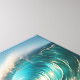 A powerful and awe-inspiring digital landscape featuring a massive turquoise wave breaking against dark, jagged mountain cliffs. The intense spray of the sea foam and the high-contrast lighting evoke a sense of raw natural beauty and cinematic drama. Perfect for large-scale wall art, modern coastal interiors, or as a striking focal point in professional offices.