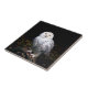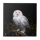 Animal portrait photograph of majestic snowy owl standing on a branch.