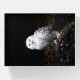 Animal portrait photograph of majestic snowy owl standing on a branch.